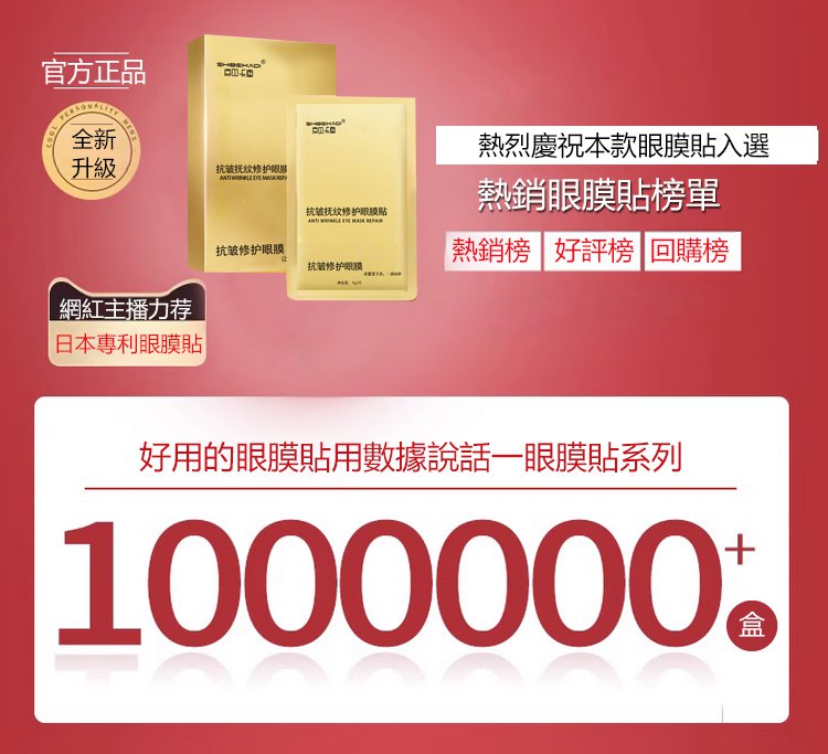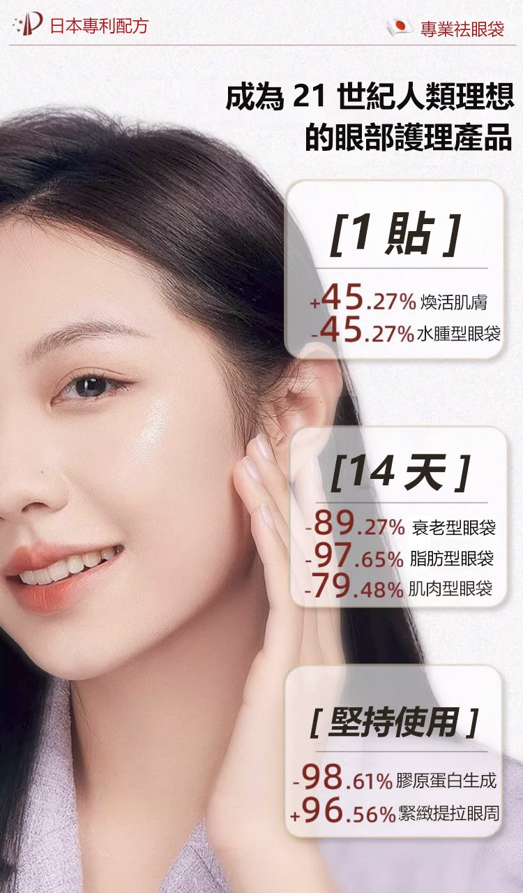 20分鐘前每晚貼一貼,輕鬆淡化眼紋、眼袋,多買多送,僅限今天!免費包郵,不滿意直接退!快下單試試吧,用了你不會後悔! - 【限時瘋搶】2入組NT$1190(16對32貼初見成效)