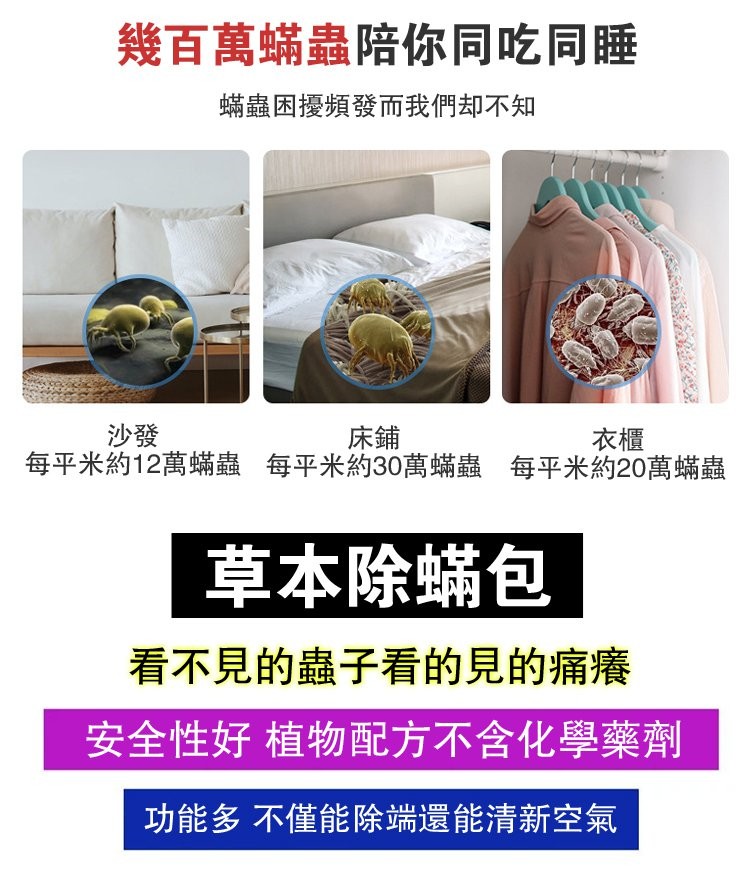 20分鐘前草本除蟎包「春夏季節」蟎蟲細菌容易滋生繁殖快,有了這款除草本除蟎包,在也不用擔心了!! - 「買三送七」十入組NT$1399(均價低至$139/盒)共100小包