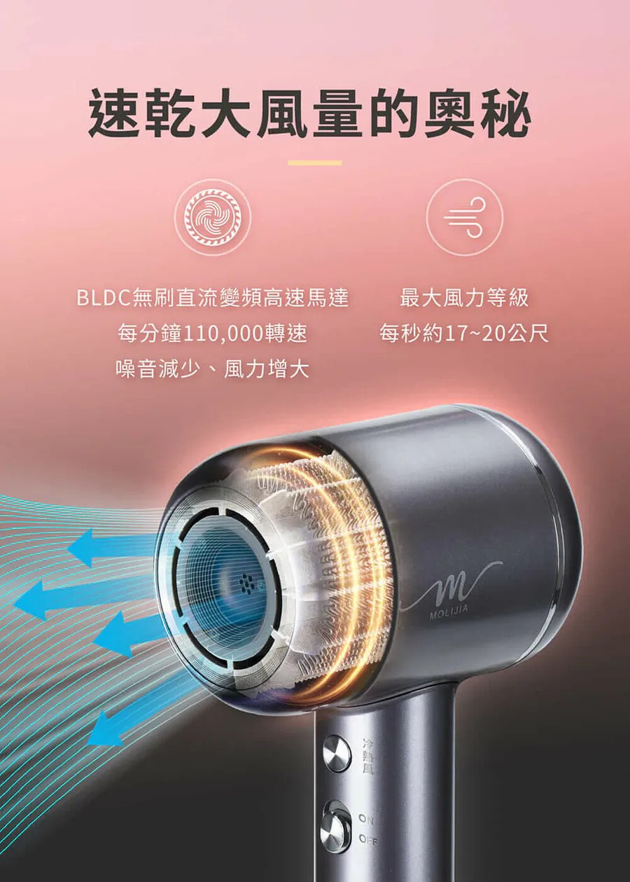 ⭐輕巧低噪音、大風量達17公尺/秒,高效速乾